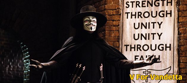 Geleceğin totaliter İngiltere’sinde geçen V, ölmekten sadece “V” olarak bilinen maskeli bir adam tarafından kurtarılan yumuşak başlı genç kadın Evey’nin hikâyesini anlatıyor. Olağanüstü karizmatik, dövüş sanatı ve aldatmacada ise müthiş yetenekli olan V, vatandaşlarını baskı ve zulme karşı koymaya davet ederek bir devrim başlatır. Anarşizmi bir çözüm olarak sunan filmin kahramanı V aslında Guy Fawkes’ten gelir. 1606’da kraliyete suikast yapmak isterken yakalanan Fawkes idam edilir. Guy Fawkes aynı filmdeki gibi parlamento binasını barut dolu fıçılarla patlatmak istemiştir. Kapitalizmin ve faşizmin yok edilmesi için anarşizmi ve şiddet kullanımını bir yöntem olarak sunan filmdir.